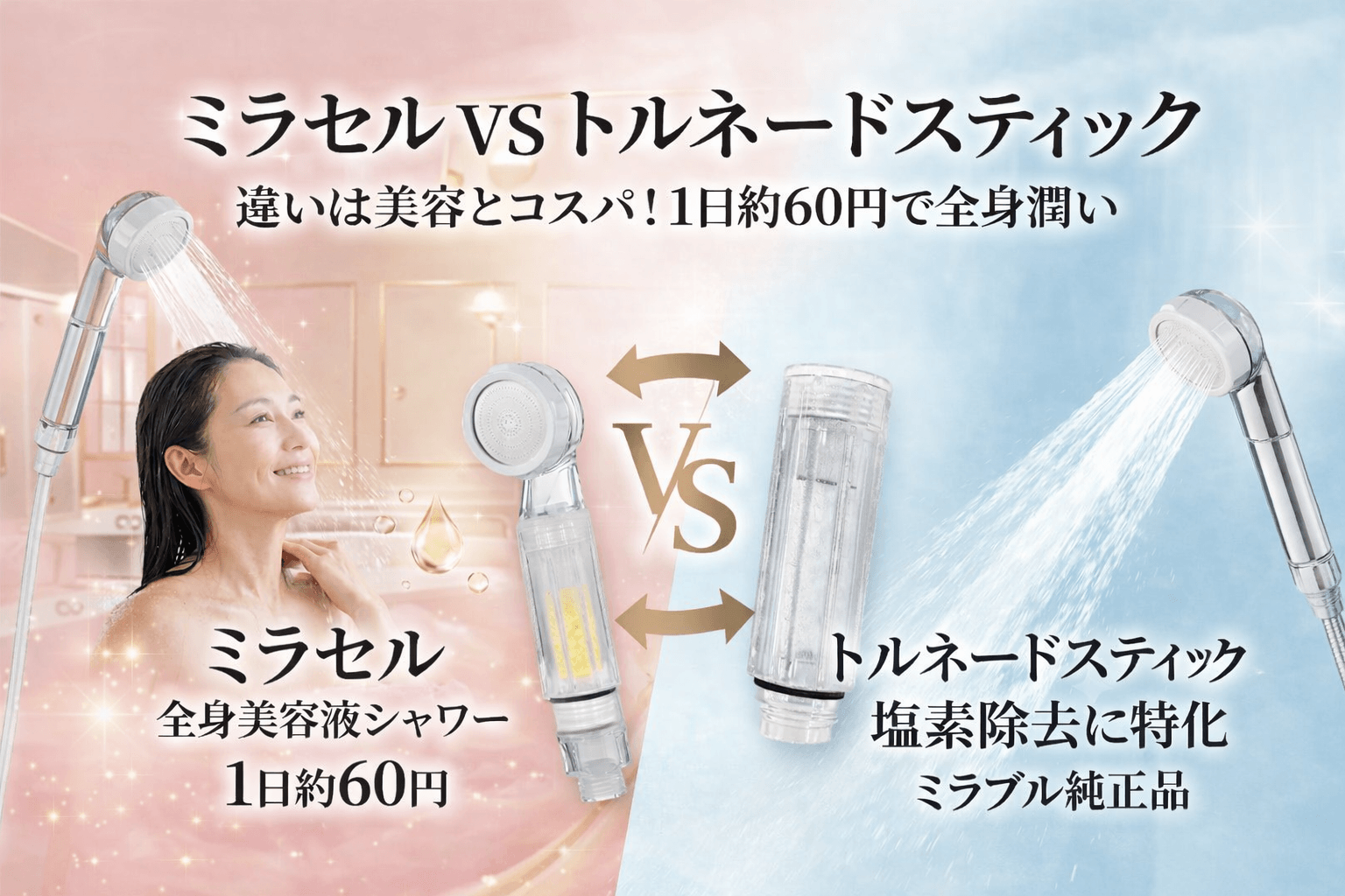 この記事では、ミラセルとトルネードスティックの違いについて解説しています。 結論から言うと、美容ケアとコスパを重視するなら「ミラセル」、塩素除去と純正品の安心感を重視するなら「トルネードスティック」が良い選択肢です。 ミラセルはヒト幹細胞... -