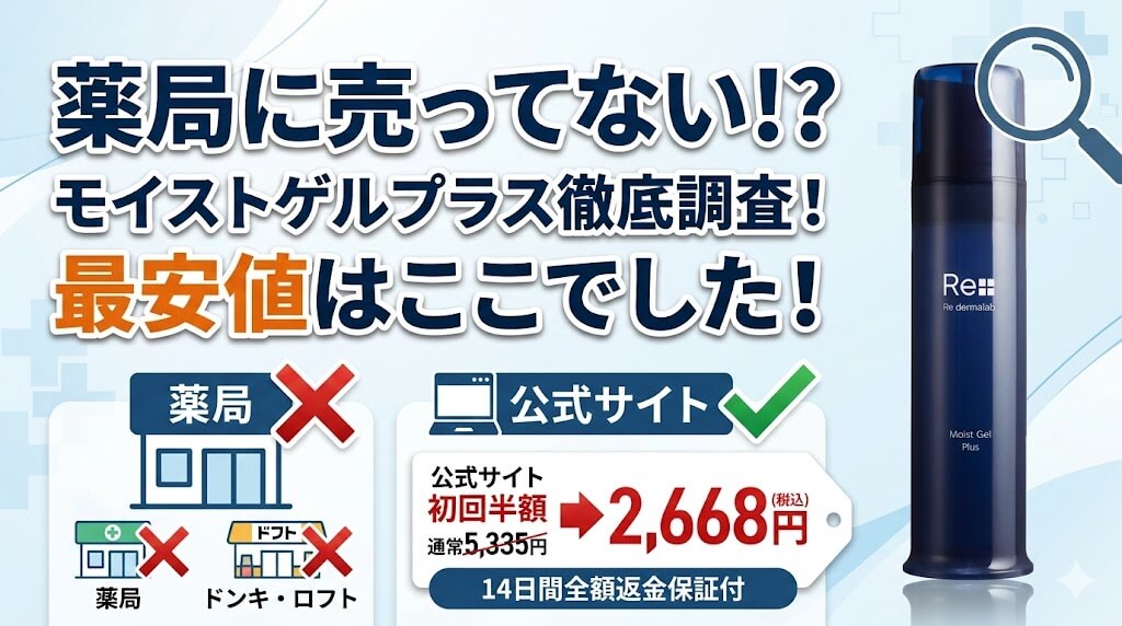 この記事では、モイストゲルプラスが薬局で買えるのか、最安値の販売店はどこかを徹底調査しました。 モイストゲルプラスはマツキヨなどの薬局では市販されておらず、最安値は公式サイトでした。 公式サイトの定期コースなら、通常価格5,335円のところ初回...